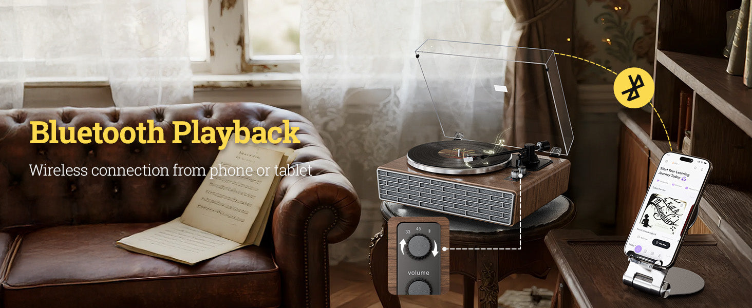 【All in One Turntable】: This turntable spins at both 33 or 45 RPM speeds,This Turntables for vinyl records can play all of your 7" 10" 12" vinyl records,and allows wireless streaming from any smart device (phone, tablet, etc.). Connect external speakers or headphones for an enhanced audio experience.