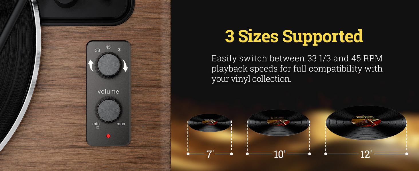 The turntable has a speed adjustment switch, and you can easily switch between 33 RPM and 45 RPM to ensure that the appropriate record is played.
